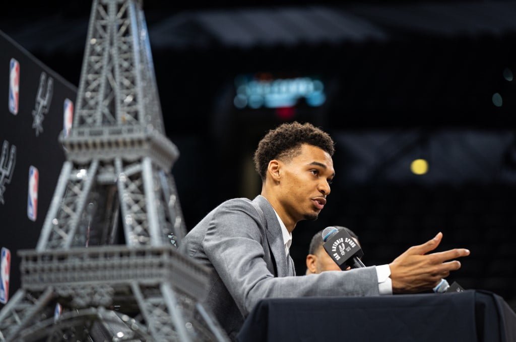 SAN ANTONIO, TX – JUNE 24: Victor Wembanyama addresses the media on June 24, 2023 at AT&T Center in San Antonio, Texas. NOTE TO USER: User expressly acknowledges and agrees that, by downloading and or using this photograph, user is consenting to the terms and conditions of the Getty Images License Agreement. Mandatory Copyright Notice: Copyright 2023 NBAE Caitlin Smith/NBAE via Getty Images/AFP (Photo by NBA Photos / NBAE / Getty Images / Getty Images via AFP)