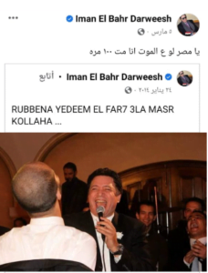 وكان آخر ما كتبه، إيمان البحر درويش قبل إعلان مرضه، وأزمته الصحية الأخيرة، عبر حسابه الشخصي بـ موقع التواصل الاجتماعي فيس بوك، قال فيه: “يا مصر لو على الموت أنا مُت 100 مرة.”