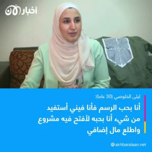 وقالت “أنا بحب الرسم، فأنا فيني أستفيد من شيء أنا بحبه لأفتح فيه مشروع واطلع مال إضافي، ممكن هو يكون أصلا الشيء الأساسي بحياتي بعد، ما بحس الإنسان دائما يكون تابع لشركة وموظف، لازم يفتح مشروعه الخاص ويكبره شوي شوي بحيث يكون له دخله الخاص، إذا قدر ينجح فيه هلا مشروعي بعد ما نجح بس بعده ببدايته”.
