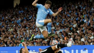 سجل خوليان ألفاريز هدفا رائعا ليقود مانشستر سيتي للفوز 1-صفر على نيوكاسل يونايتد في أول مباراة لحامل اللقب بملعبه في الموسم الجديد للدوري الإنجليزي الممتاز لكرة القدم، ليكلل أمسية الاحتفال بثلاثية الموسم الماضي في استاد الاتحاد.