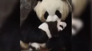 انتشر على مواقع التواصل الاجتماعي، مقطع فيديو لأنثى باندا تحتضن صغيرها في القفص بعد خضوعه لفترة علاج قصيرة.