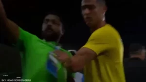 وبعد انتهاء المباراة، ظهر أحد عناصر الطاقم التدريبي لشباب الأهلي، وهو يحاول التقاط صورة “سيلفي” مع رونالدو أثناء خروجه، لكن الأخير قام بدفعه بقوة وأكمل طريقه خارجا.